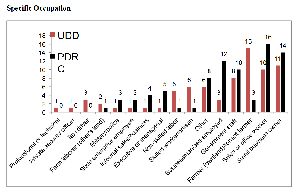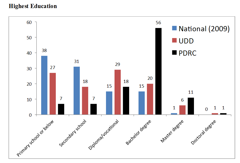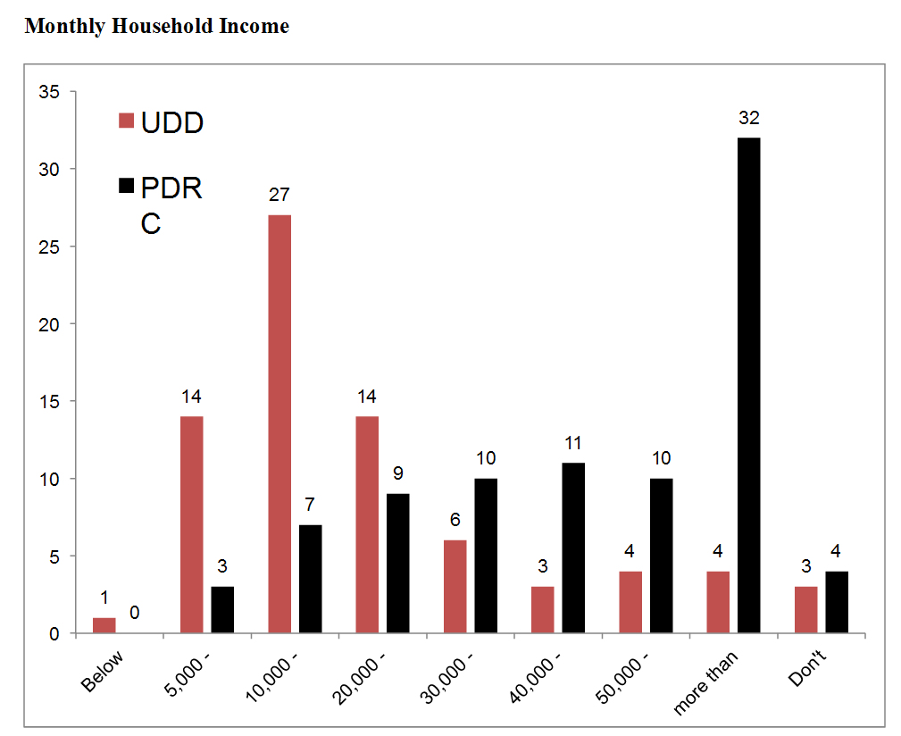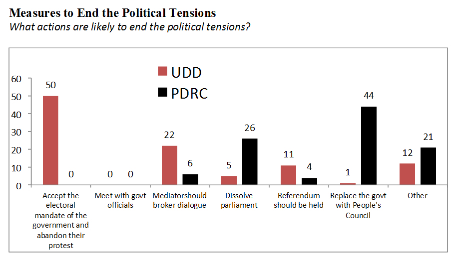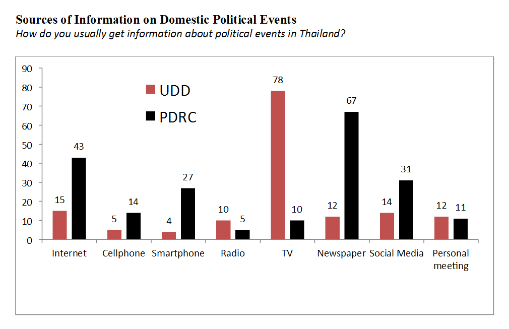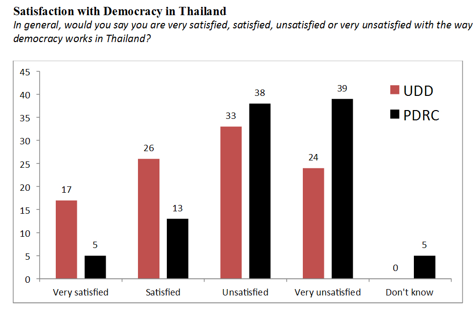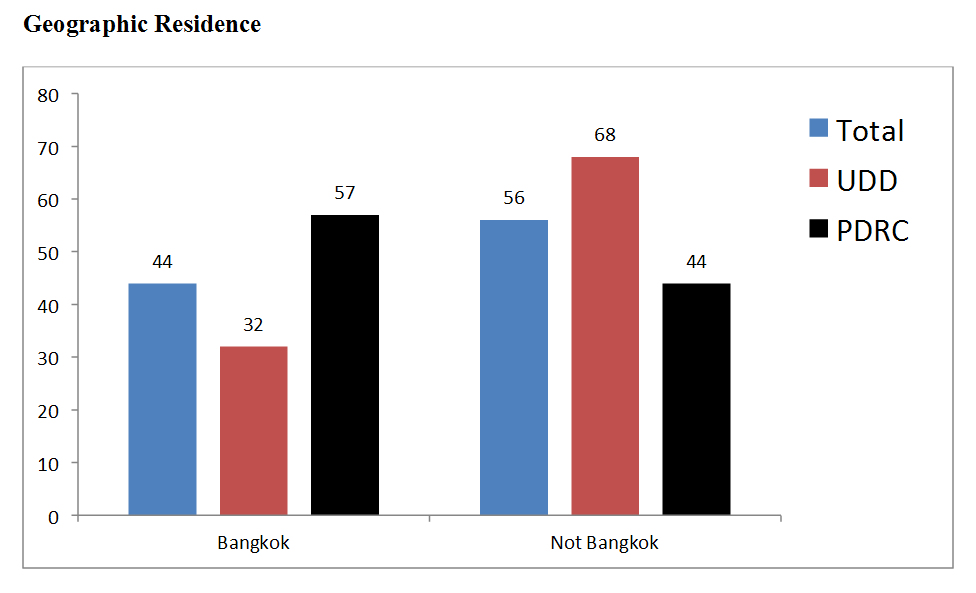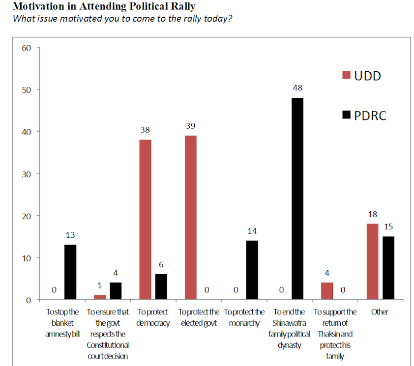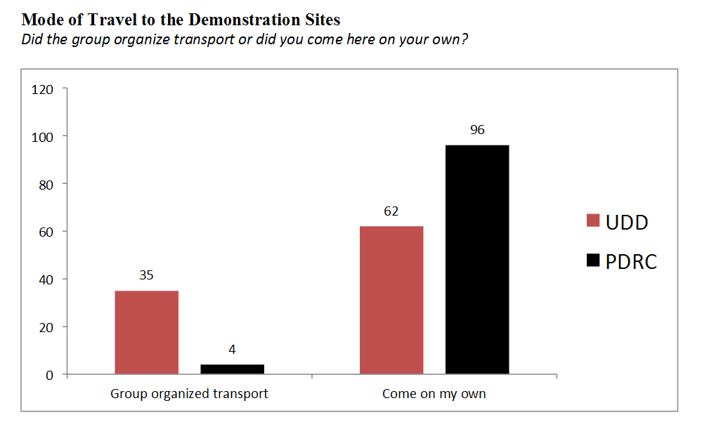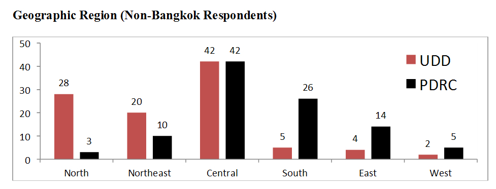 The methodology applied was designed to maximize the randomness of the sample. Enumerators were instructed to plan a serpentine path through the entire physical area of the demonstrations to account for the fact that groups of protestors travelling from various locations might be concentrated in one area. To further randomize the sample and avoid selection bias, enumerators followed a skip pattern (every 20people) to select individual respondents at Ratchamangkla Stadium and in the four PDRC sites. Taking into account the final sample size achieved for the PDRC and red shirt gatherings, the margin of error for both samples is approximately 8% at a confidence level of 95%.As indicated in presentation and analysis that follows, in the case of a few questions the enumerators recorded multiple responses, which results in total percentage figures larger than 100% when all responses are tallied. In some questions, the rounding off of data to whole numbers results in a few cases in which the tallied results equal 101% rather than 100%.Methodological