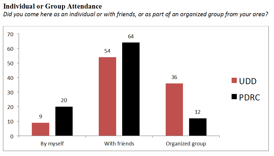 Caveat: The survey sample represents the extremes of public sentiment, since the vast majority of crowds in the two different gatherings consisted of people who were sufficiently motivated to devote time and energy in support of their respective political causes. Accordingly, the findings should not be viewed as representative of the public at large. While all possible steps were taken within the parameters of available time to enhance the rigor of the survey, the sample size achieved was modest and the margin of error in any finding commensurately large. Despite these limitations, the fast estimates obtained may be considered as indicative of the true values, consistent with the aim of this rapid survey. Notwithstanding the limitations of the sample size and methodology, it is hoped that the findings of this rapid survey will contribute to an understanding of the demographics of the political activists in the respective groups and of respondent perspectives on certain issues."